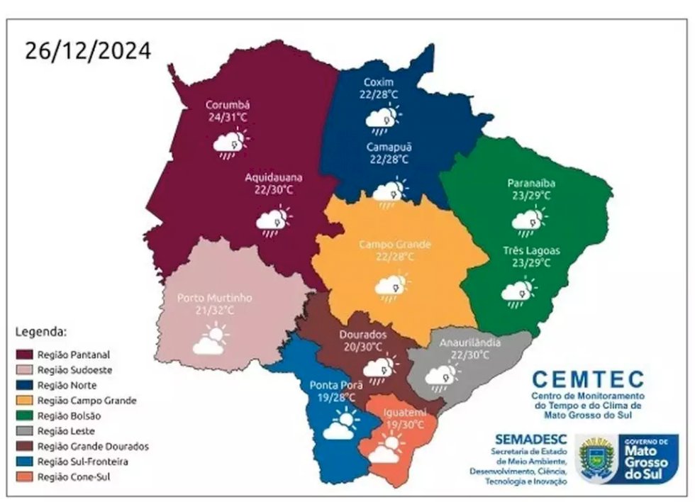 A quinta-feira (26) pós-feriado de Natal continuará chuvosa em todo Mato Grosso do Sul, devido ao avanço de uma frente fria que mantém o tempo instável no Estado.