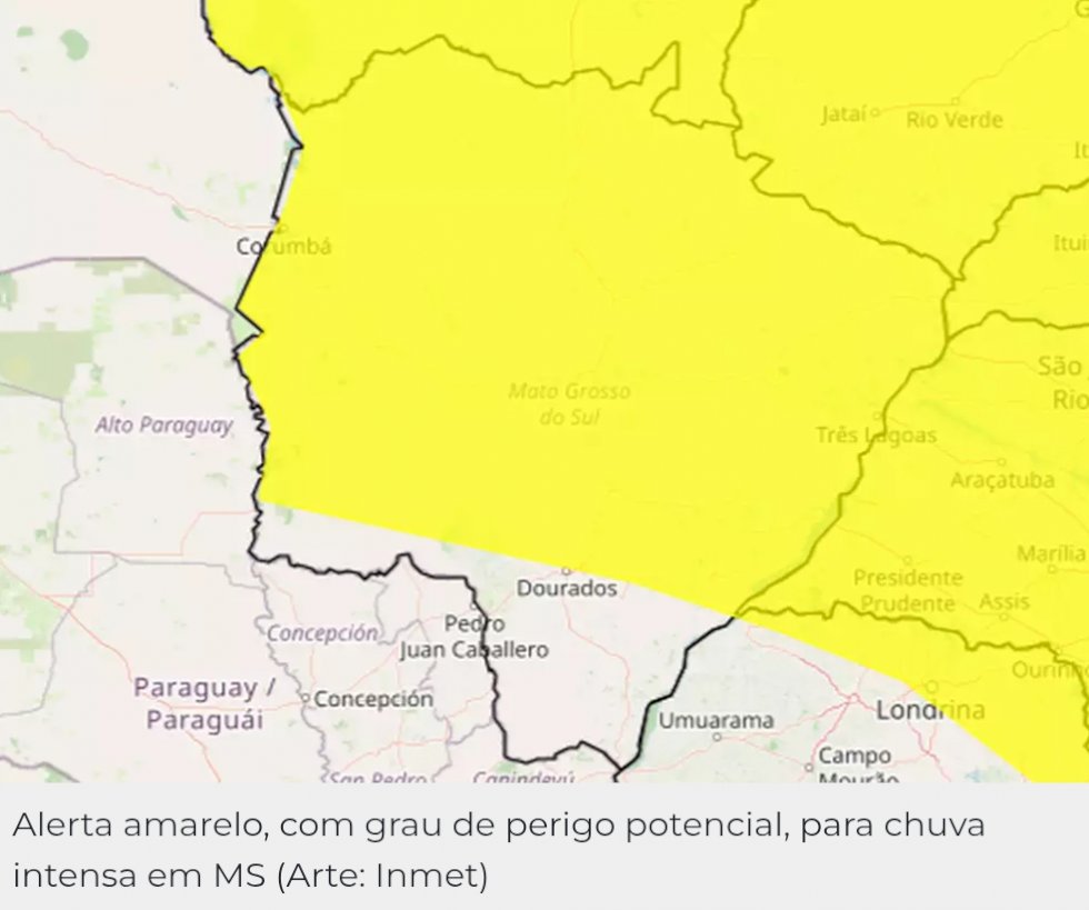 O Inmet (Instituto Nacional de Meteorologia) emitiu alerta para chuva intensa entre hoje e o fim da noite de sábado. O aviso vale para Campo Grande, Água Clara, Alcinópolis, Anastácio, Anaurilândia, Angélica, Aparecida do Taboado, Aquidauana, Bandeirantes, Bataguassu, Batayporã, Bela Vista, Bodoquena, Bonito, Brasilândia, Camapuã, Caracol, Cassilândia, Chapadão do Sul, Corguinho, Corumbá, Costa Rica, Coxim, Deodápolis, Dois Irmãos do Buriti, Douradina, Dourados, Fátima do Sul, Figueirão e Glória de Dourados.
