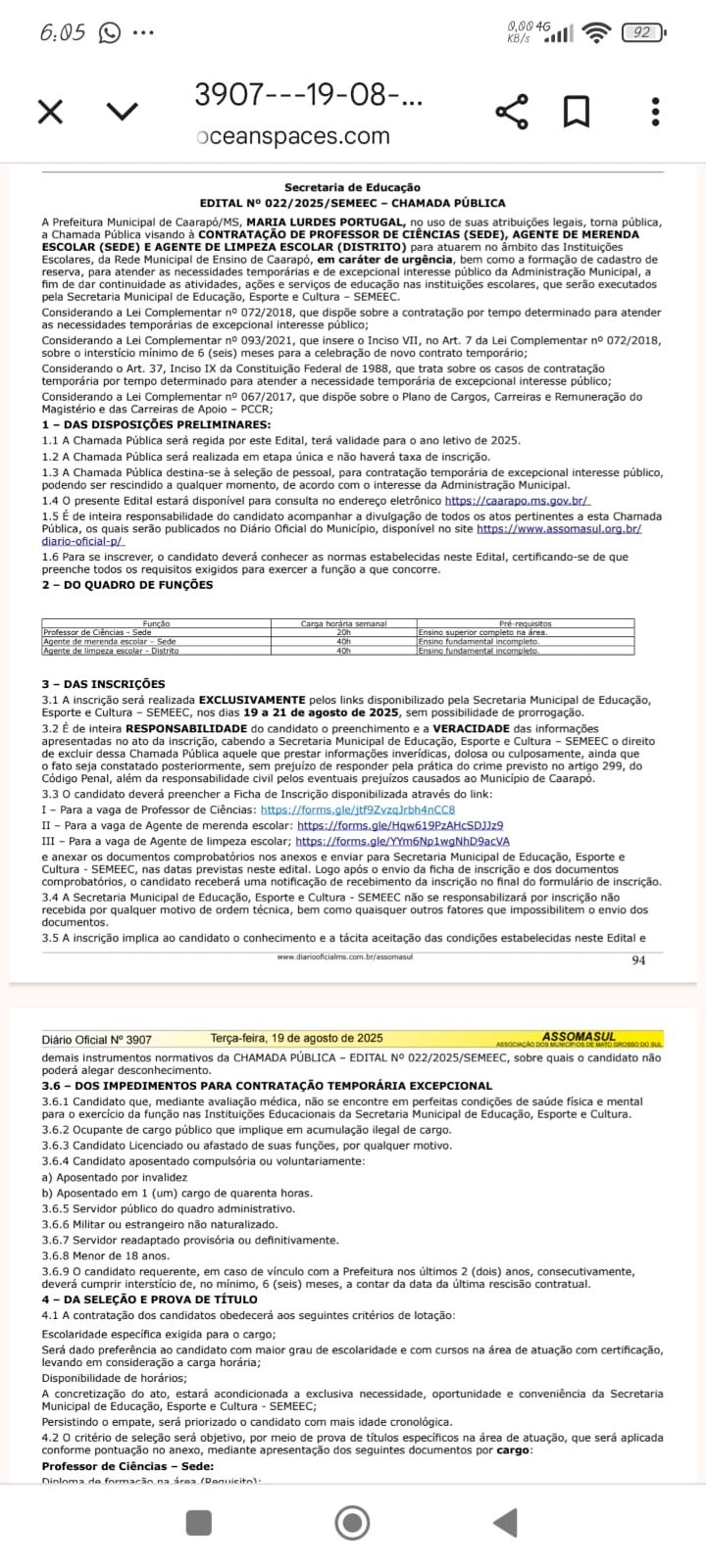 O documento, assinado pela prefeita Maria Lurdes Portugal, torna pública a contratação emergencial de professor de Ciências (sede), agente de merenda escolar (sede) e agente de limpeza escolar (distrito), além da formação de cadastro de reserva. A justificativa apresentada é a “necessidade temporária e de excepcional interesse público”, conforme previsto na Lei Complementar nº 072/2018, que dispõe sobre contratações por tempo determinado.