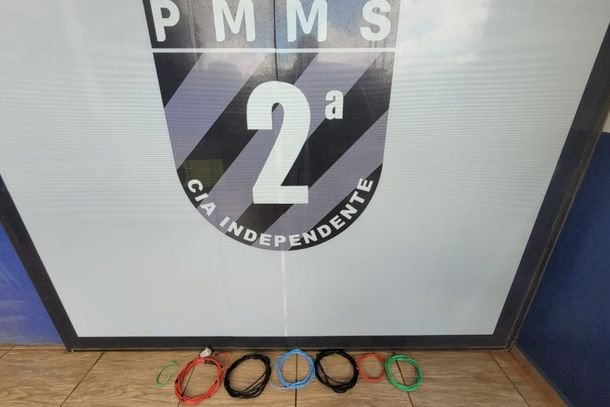 Durante a abordagem, realizada em frente à uma residência, os policiais encontraram sete rolos de fios de diferentes cores e espessuras em posse do suspeito, identificado pelas iniciais D.R. de S. Ao ser questionado, ele confessou ter furtado o material de uma construção localizada nas proximidades do cemitério municipal, no bairro Novo, mas não soube informar o endereço exato do local.