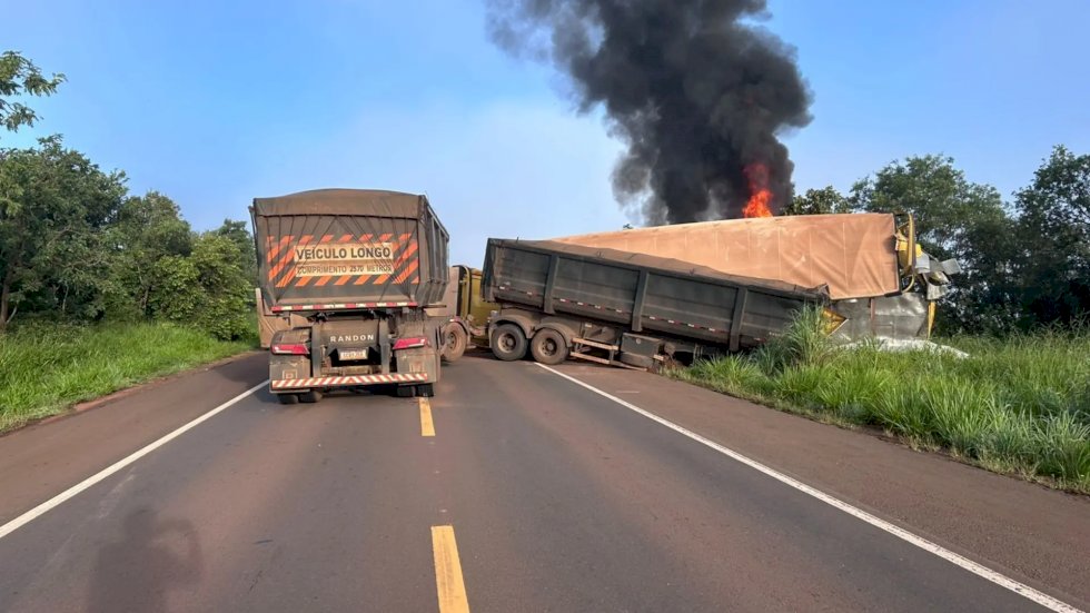Acidente envolvendo duas carretas interditou totalmente a BR-262 na manhã desta sexta-feira (13), no trecho entre os municípios de Água Clara e Ribas do Rio Pardo. Os veículos colidiram frontalmente e um deles pegou fogo.