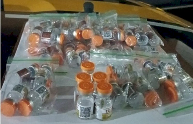 Durante a vistoria, os policiais localizaram 79 ampolas de medicamentos para emagrecimento, todos de origem estrangeira e sem a devida regularização para entrada e comercialização no Brasil.