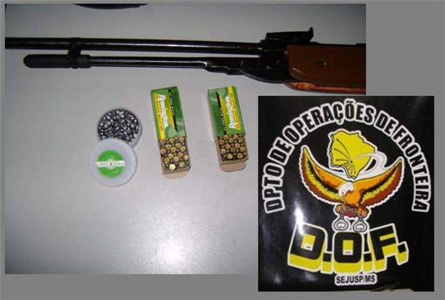 Durante vistorias foi encontrada sob o banco traseiro 01 (uma) espingarda de ar comprimido (espingarda de pressão), juntamente com um frasco plástico contendo 200 (duzentos) chumbinhos, bem como 100 (cem) cartuchos de munição calibre 22 mm da marca Remington. Questionado sobre a mercadoria Siegfried informou ter adquirido na feirinha na cidade de Corumbá/MS. Diante dos fatos, Siegfried recebeu voz de prisão e foi conduzido à Delegacia de Polícia Civil de Corumbá/MS, para as providências cabíveis.