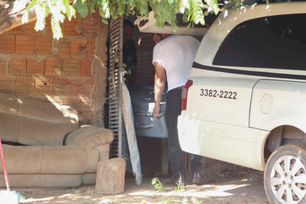 A vítima foi morta dentro da residência, enrolada em um colchão, levada até o terreno e queimada. No corpo, há lesões de faca nas costas e na costela, além de uma marca de foice no peito.