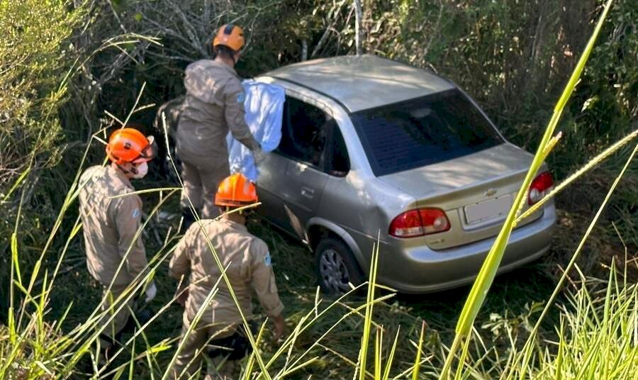 Carro Chevrolet Corsa caiu em um barranco, às margens da MS-473, em Taquarussu, e provocou a morte do motorista Alenkar Moraes, 44 anos, na manhã desta segunda-feira (13).