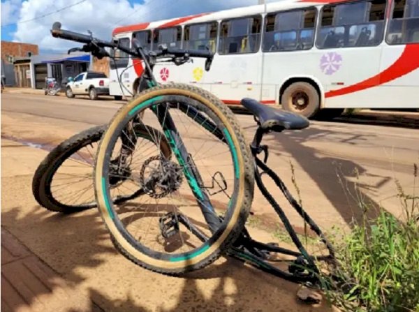 O menino estava pedalando sozinho, quando foi parar debaixo do veículo. A bicicleta ficou completamente destruída