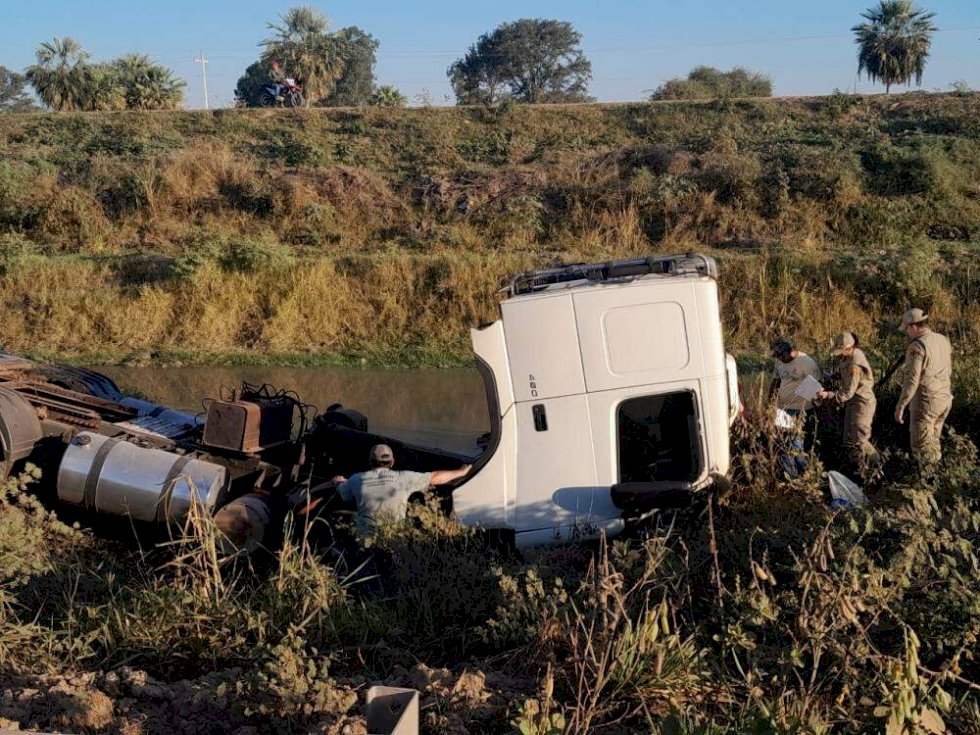 Carreta carregada com soja tomba em estrada vicinal e deixa motorista ferido