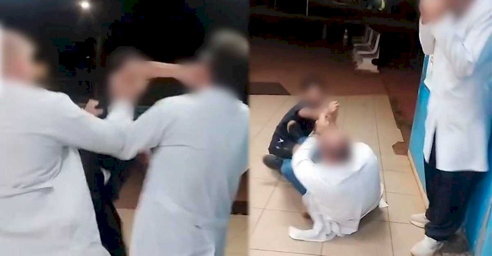 Nos vídeos que estão circulando nas redes sociais, é possível ver dois homens de jaleco brigando com um rapaz, que tenta acertar um soco no outro. No entanto, é contido e chega a cair no chão, desferindo pontapés contra os dois.