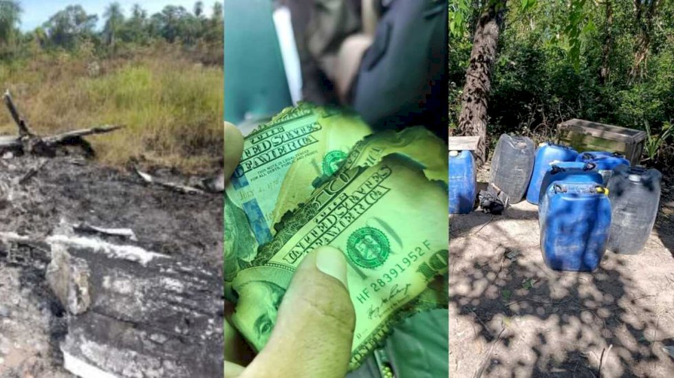 O avião foi localizado a cerca de 700 metros da pista ilegal e, entre os destroços carbonizados, os agentes encontraram notas de US$ 100 queimadas, reforçando a suspeita de atividade criminosa.
