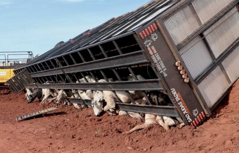 Caminhão que transportava bois tombou e matou cerca de 10 animais na rodovia BR-163, entre Jaraguari e Campo Grande, na madrugada deste sábado (21). O trecho onde ocorreu o acidente estava em obras.