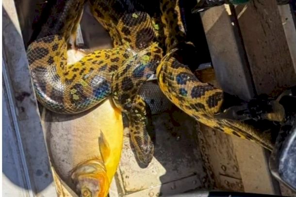 Grupo de mulheres que pescava na região do Pantanal de Porto Morrinho, em Corumbá, Mato Grosso do Sul, foi surpreendido pela invasão de uma sucuri-amarela (Eunectes notaeus) em um dos barcos, enquanto a equipe fazia uma parada para o almoço.